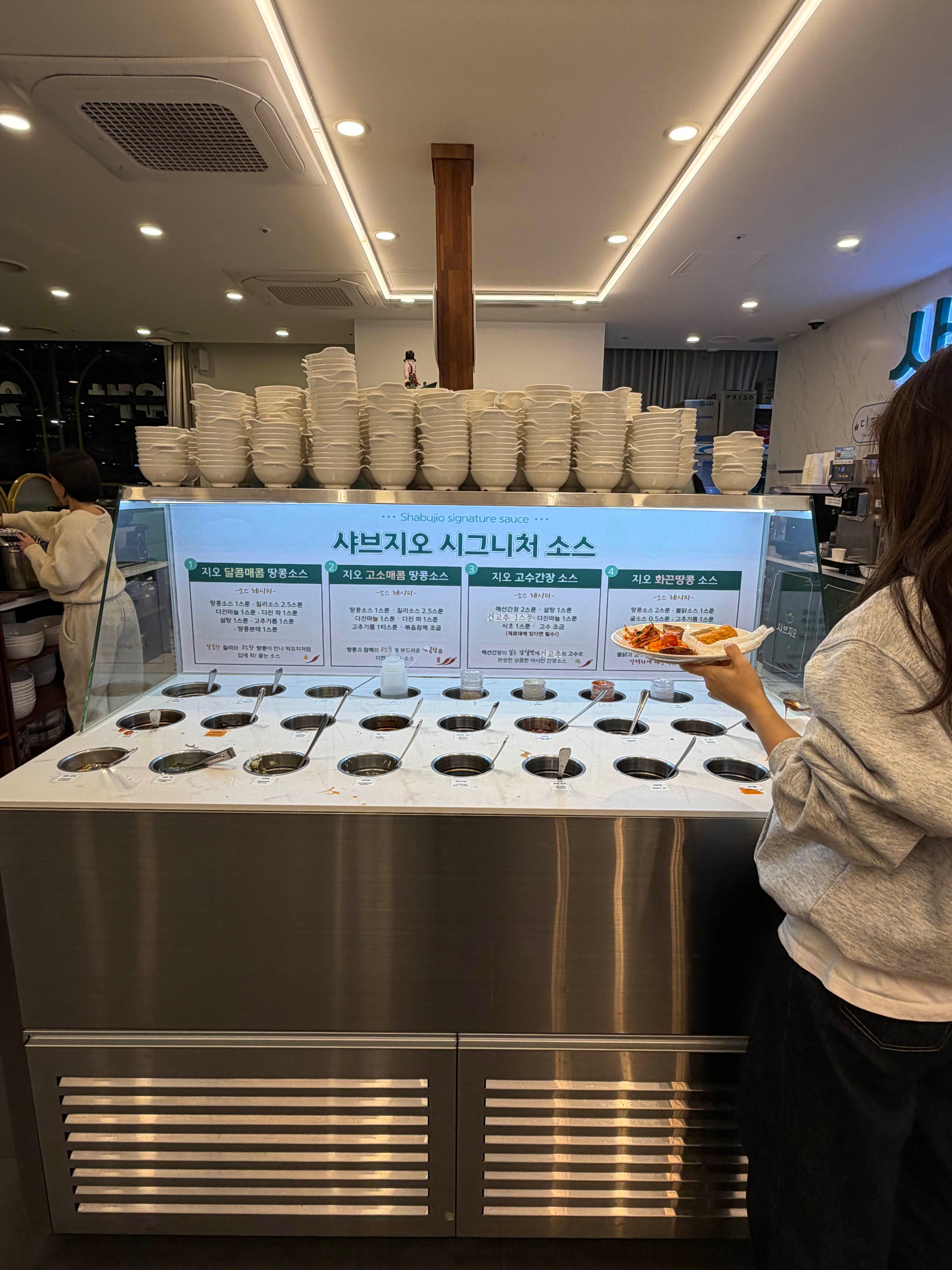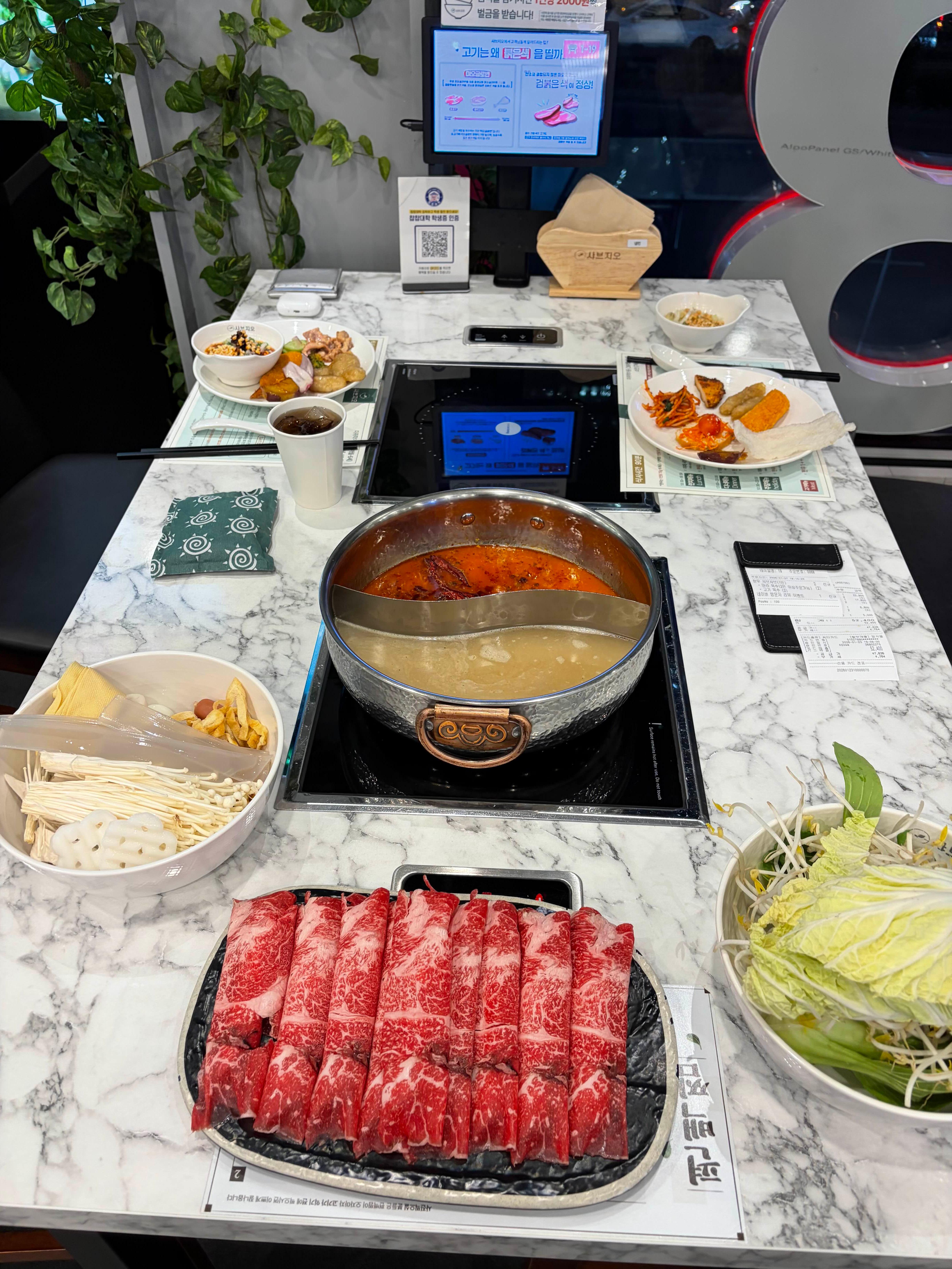 친구가 샤브샤브 먹고 싶다고 하고, 저는 하이디라오처럼 뷔페식으로 이것저것 골라 먹고 싶었는데, 딱 이 두 가지를 다 충족시켜준 곳이 있었어요. 평일 오후 6시 10분쯤 도착했는데 대기 없이 바로 창가 자리에 앉을 수 있었어요.