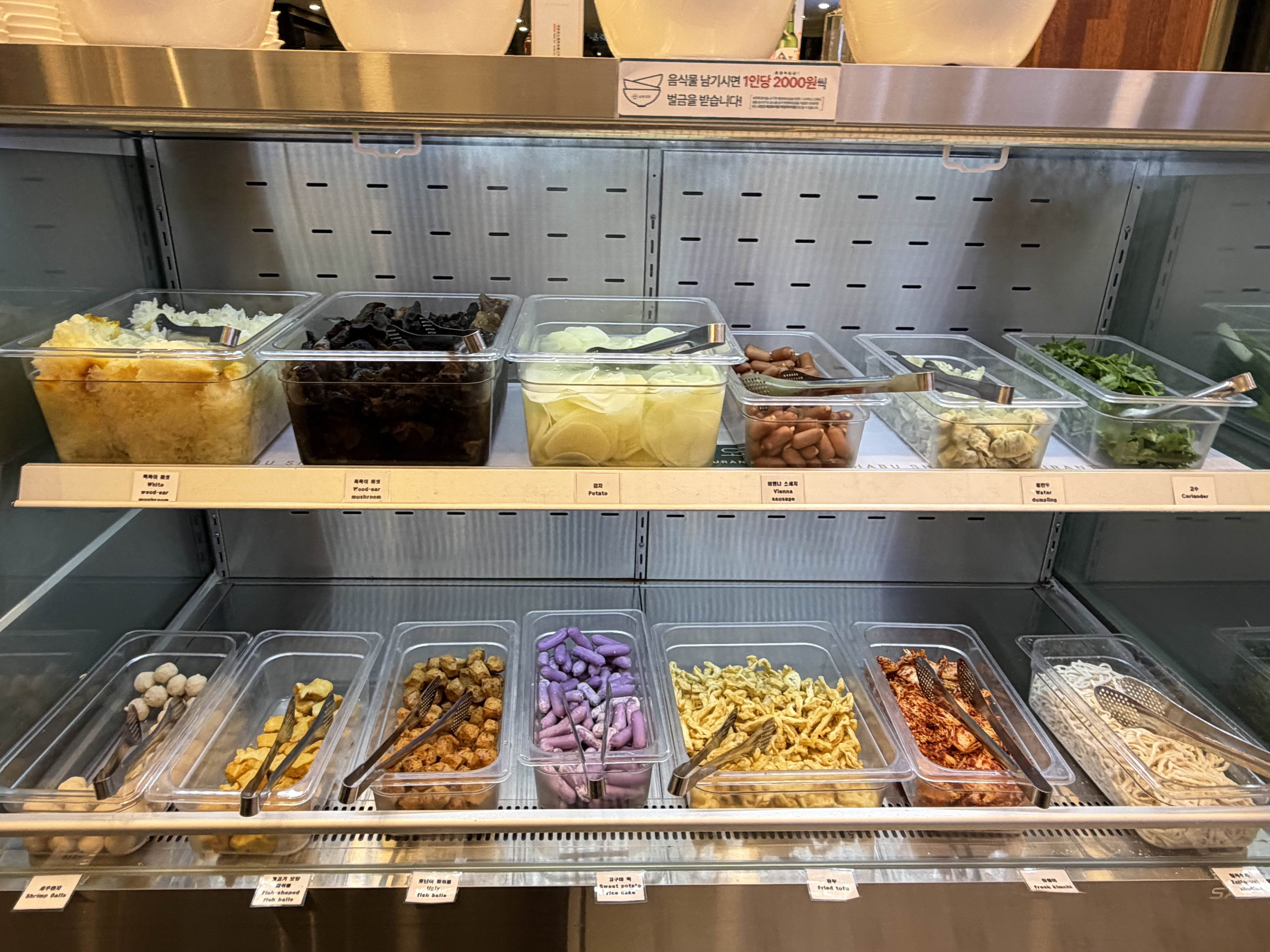 그리고 토핑 코너에는 메추리알, 만두, 어묵, 쫄면, 옥수수면, 칼국수면까지 있어서 취향껏 조합할 수 있었어요. 나는 쫄면 + 칼국수 반반으로 넣었는데, 국물에 익으면서 쫄깃한 식감이 살아서 좋았어요.