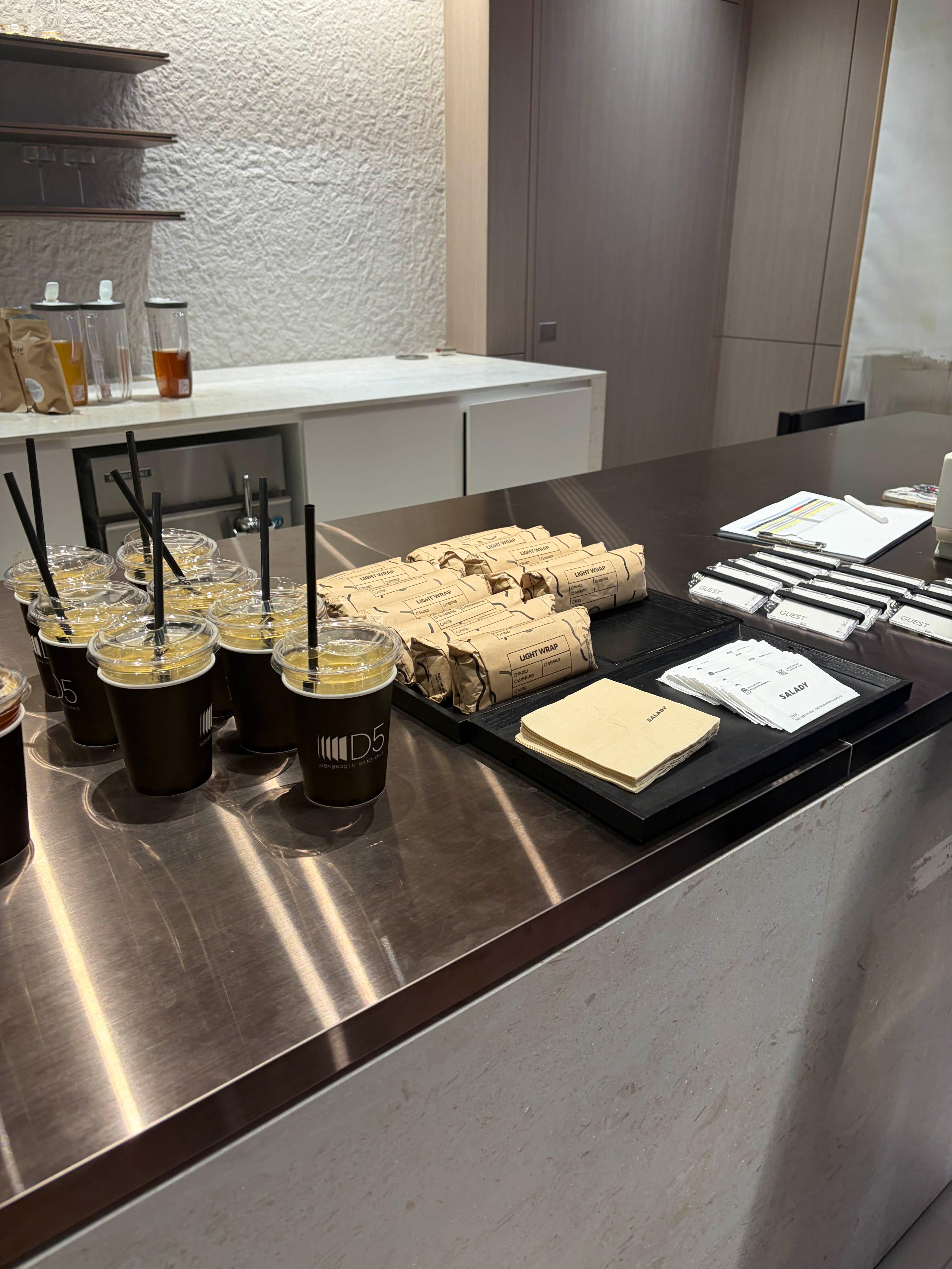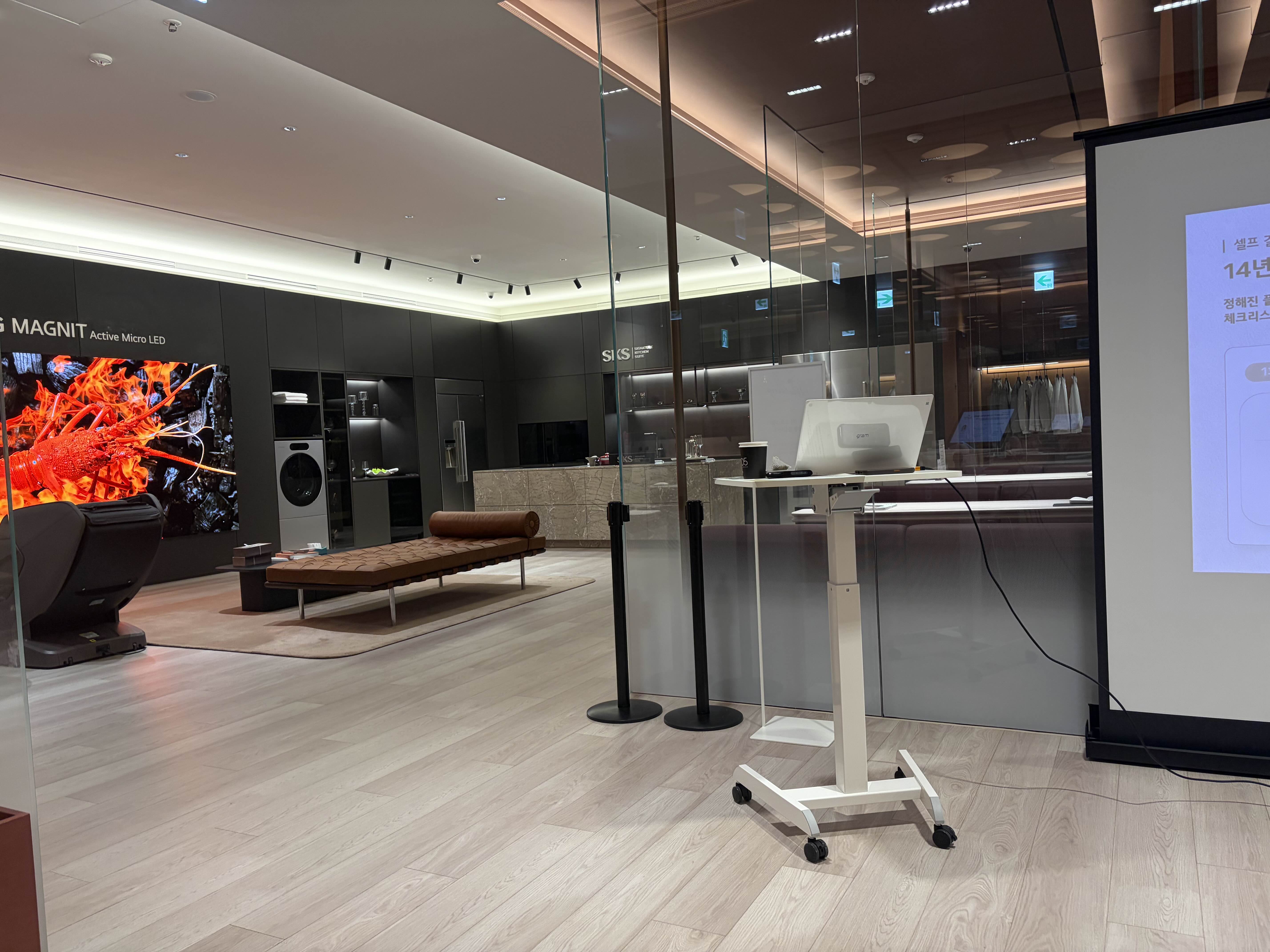 행사장이 LG전자 플래그십 내부에 마련돼 있었는데, 예상보다 잘 준비된 공간이라는 인상을 받았습니다. 백화점 라운지처럼 꾸며진 인테리어에, 입장 시 음료와 간식까지 준비되어 있어 대접받는 느낌이 들었습니다.